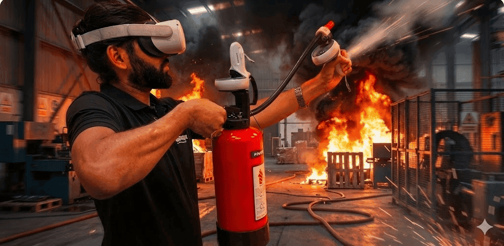 Trainees switch from VR controllers to a physical, VR-integrated extinguisher that replicates real-world handling.