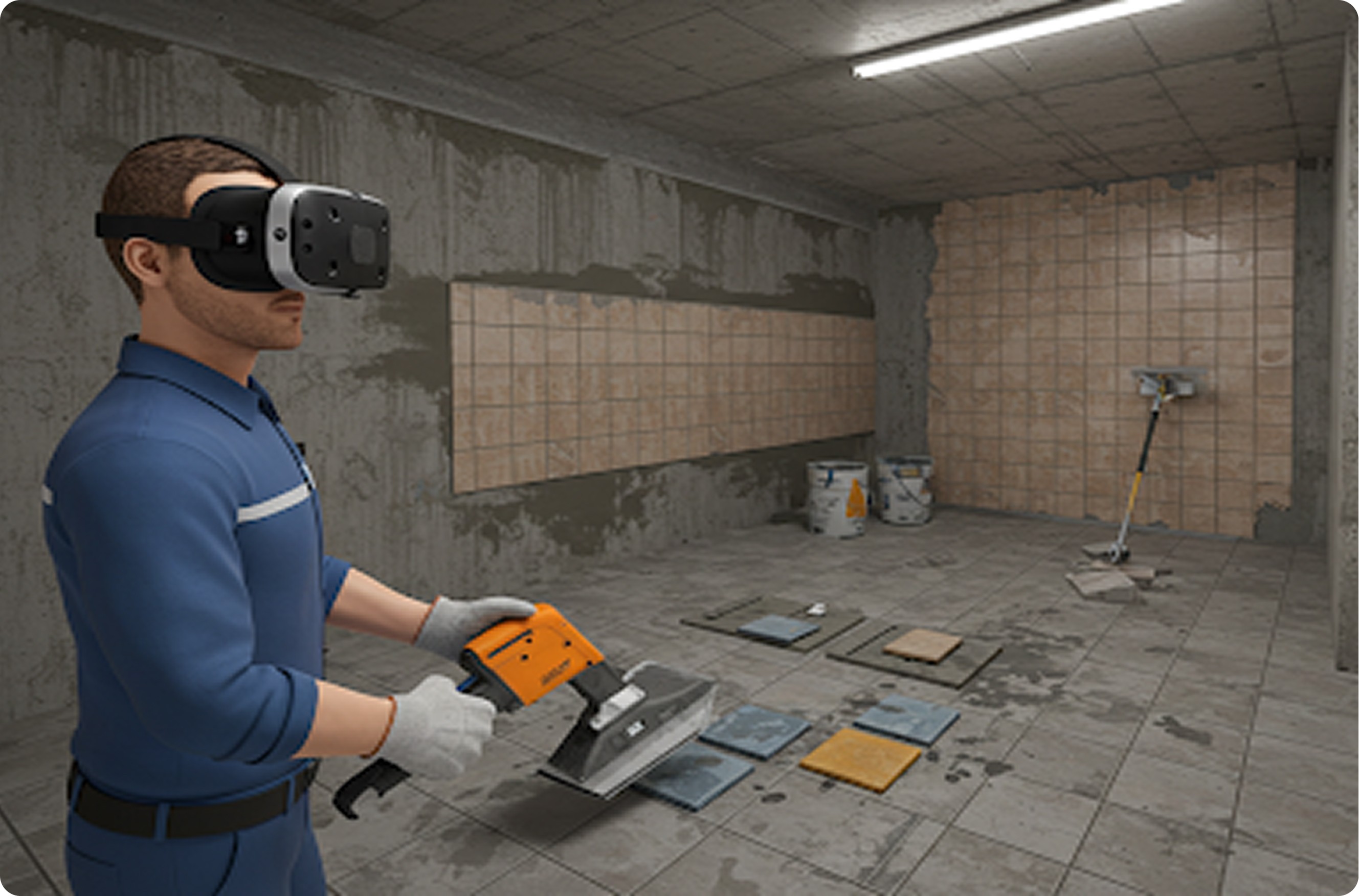 Built for the Oculus Quest 2, the simulator offers a highly realistic, hands-on experience by allowing users to train with real tools—such as notch trowels and mixers—enhancing skill transfer and on-site readiness. From surface preparation and adhesive mixing to tile placement, leveling, and finishing, trainees are guided through tutorial and assessment modes for effective, experiential learning.